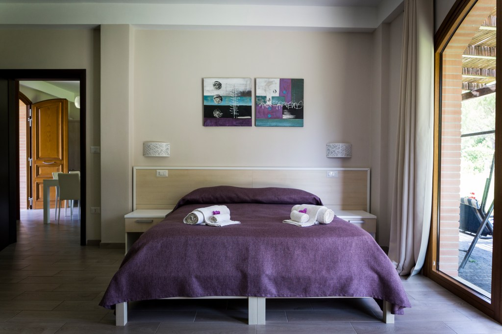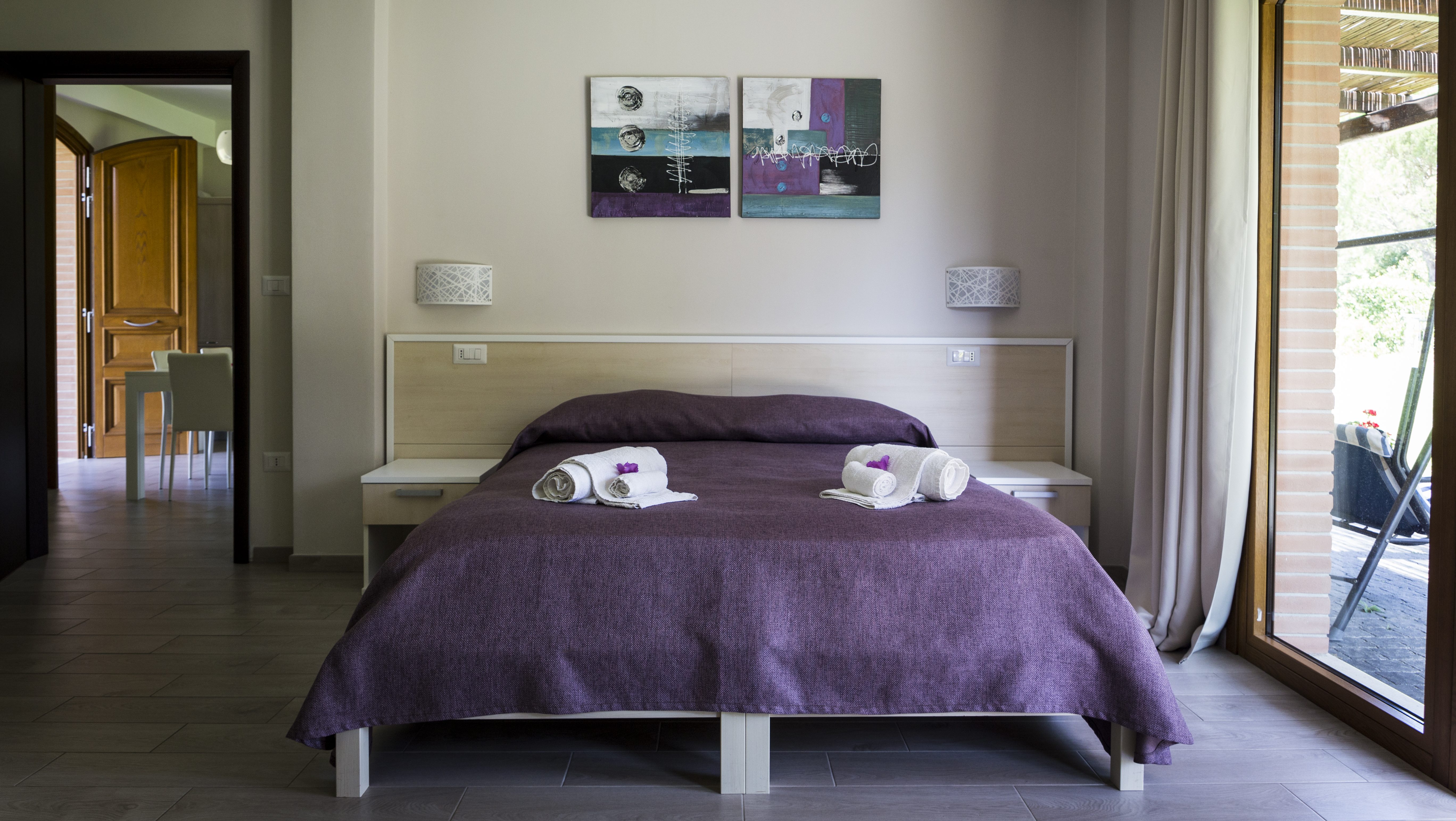 Due ampie camere di circa 30mq , con bagno privato, alle quali si accede sia passando per la cucina/salotto comune che direttamente dall’esterno attraverso le ampie vetrate che affacciano sul nostro giardino.